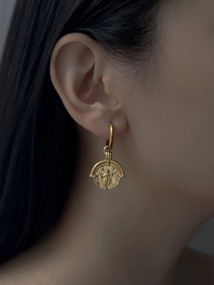 GABI STUDIO /Ā Statement gold ancient coin pendantsĀ on stainless steel hoops.