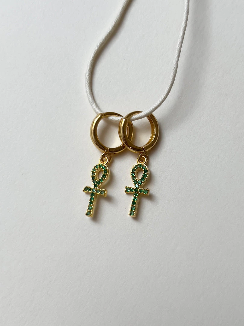 GABI STUDIO / Chic gold huggie earrings with ancient Egyptian symbol of life (the Ankh) pendants encrusted in gemstones. Also available in Royal Blue.