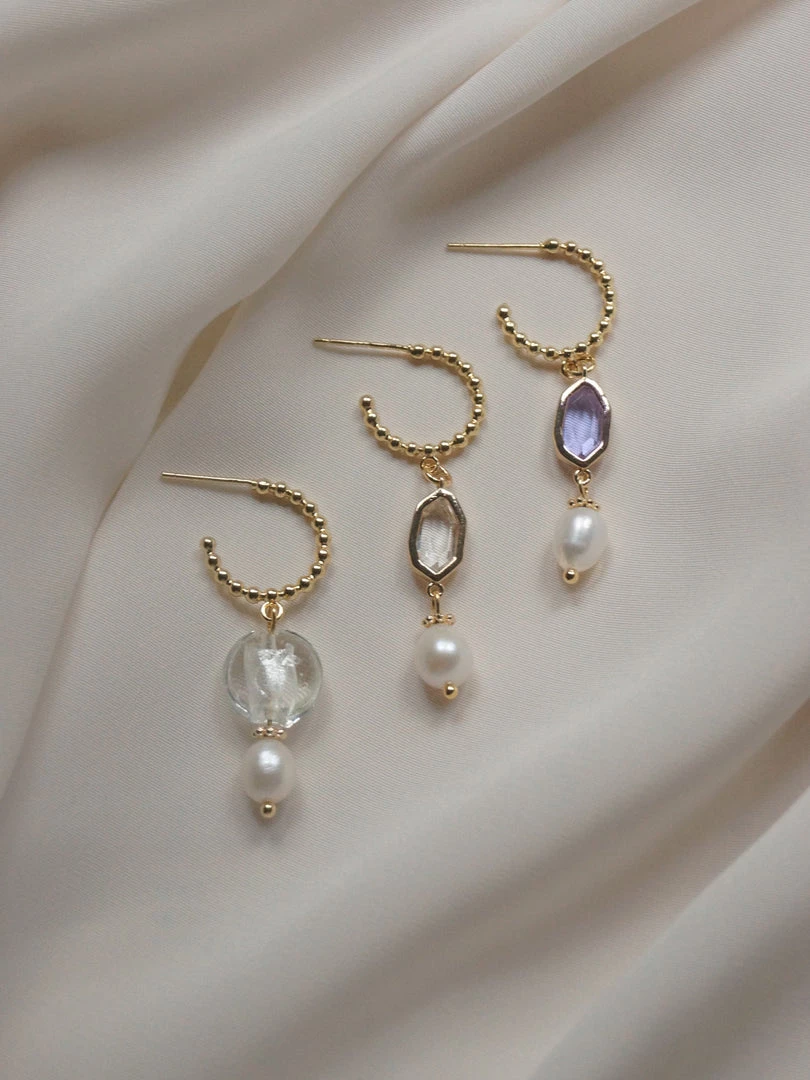 - 18K Gold plated brass with S925 earposts, freshwater pearls, glass