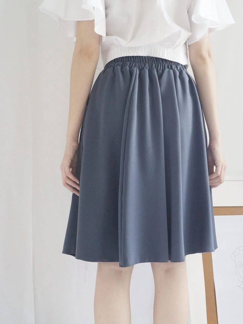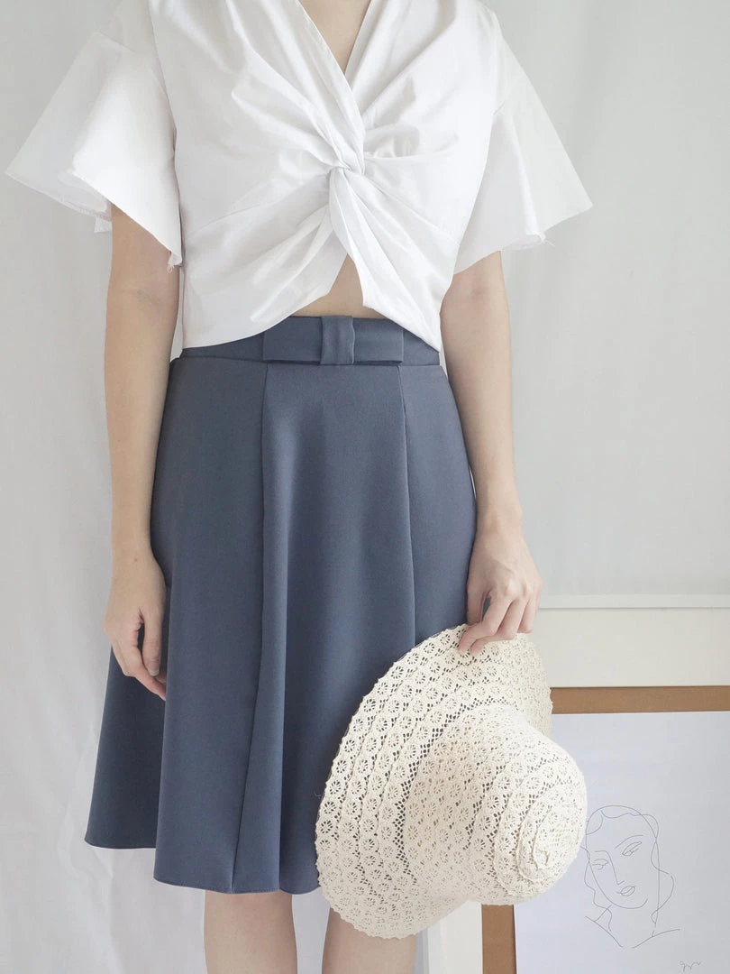 A feminine knee-length skirt with a charming, subtle ribbon detail at the front. For a comfortable everyday wear that’s both fun and work-appropriate.