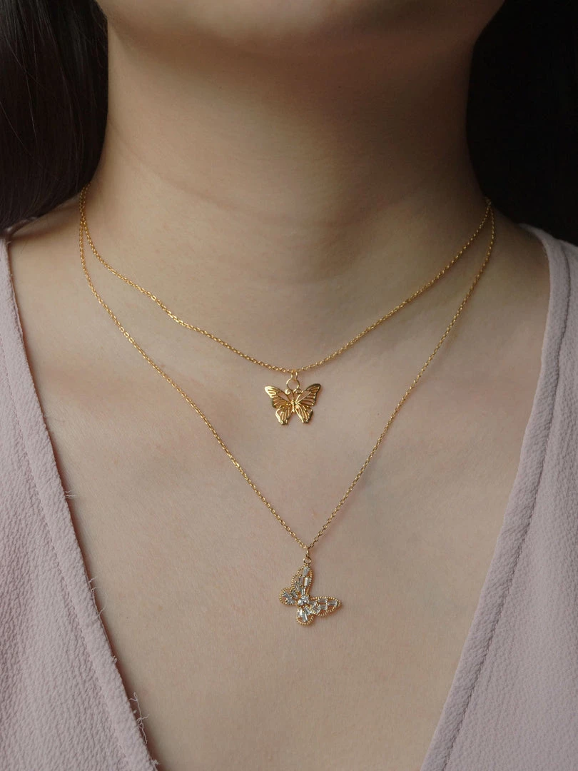 - Butterfly charm: 18K Gold plating over copper, cubic zirconia