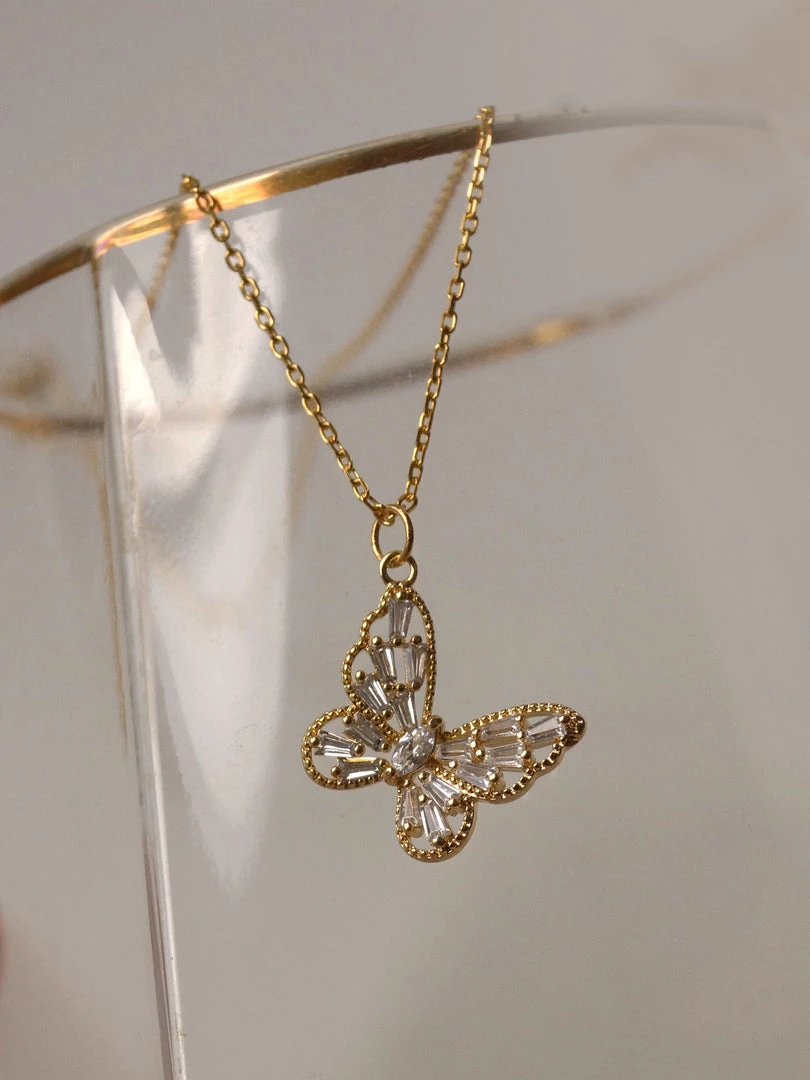 A sweet butterfly charm necklace with gorgeous inlaid cubic zirconia.
