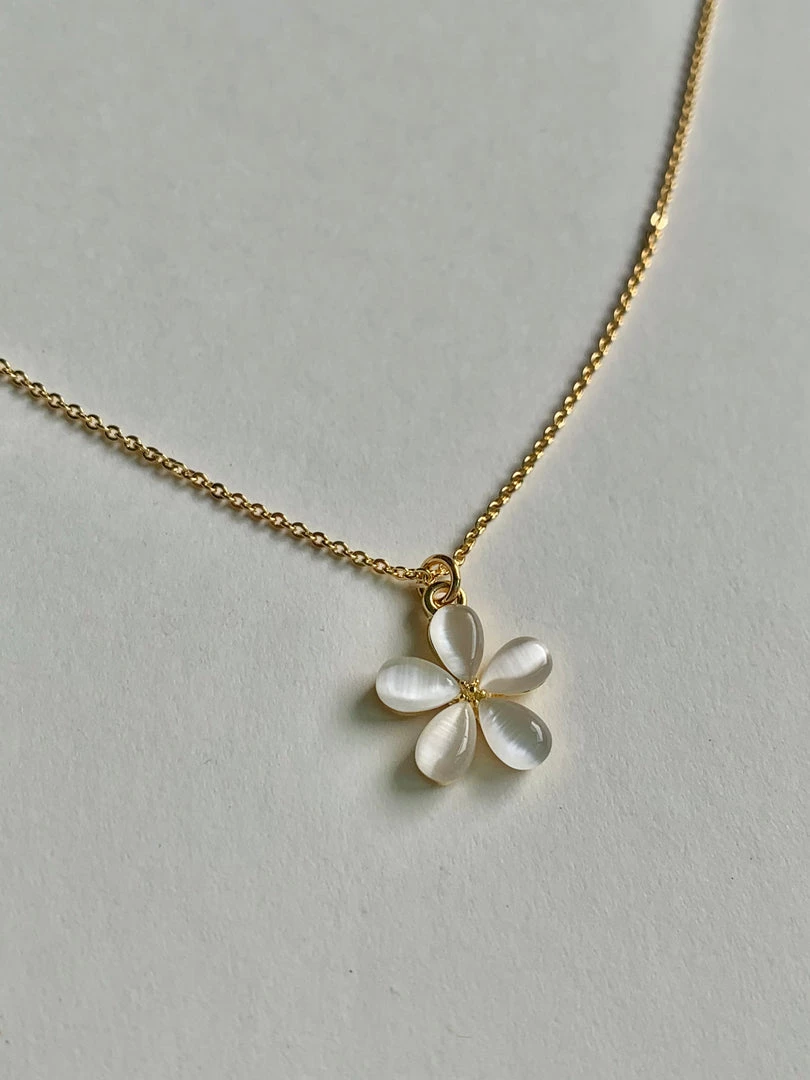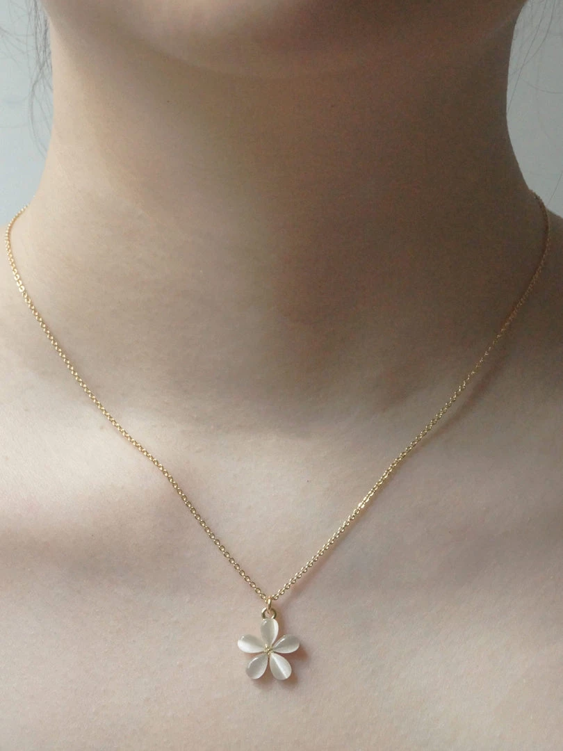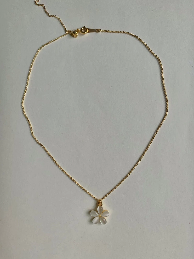 Dainty flower pendant on a delicate gold-plated necklace chain.