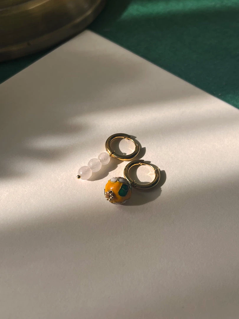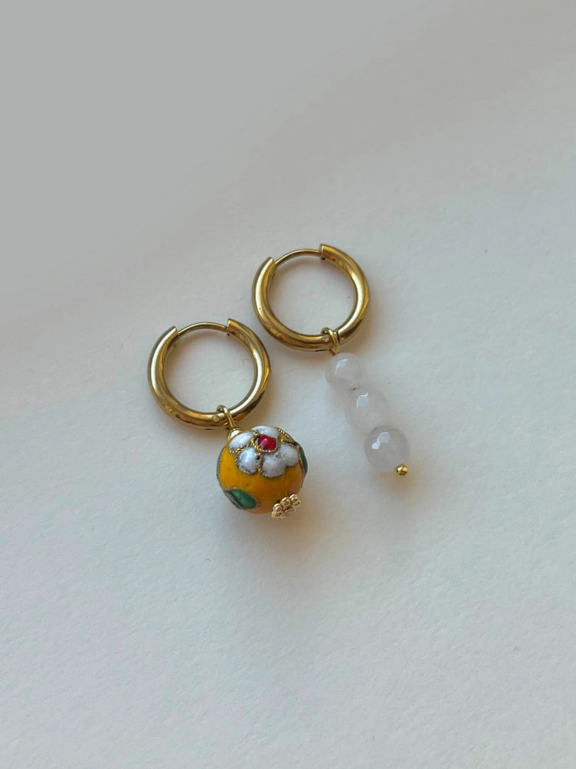 GABI STUDIO / Charming mismatched earrings with semi-precious stones and an eclectic cloisonne bead.