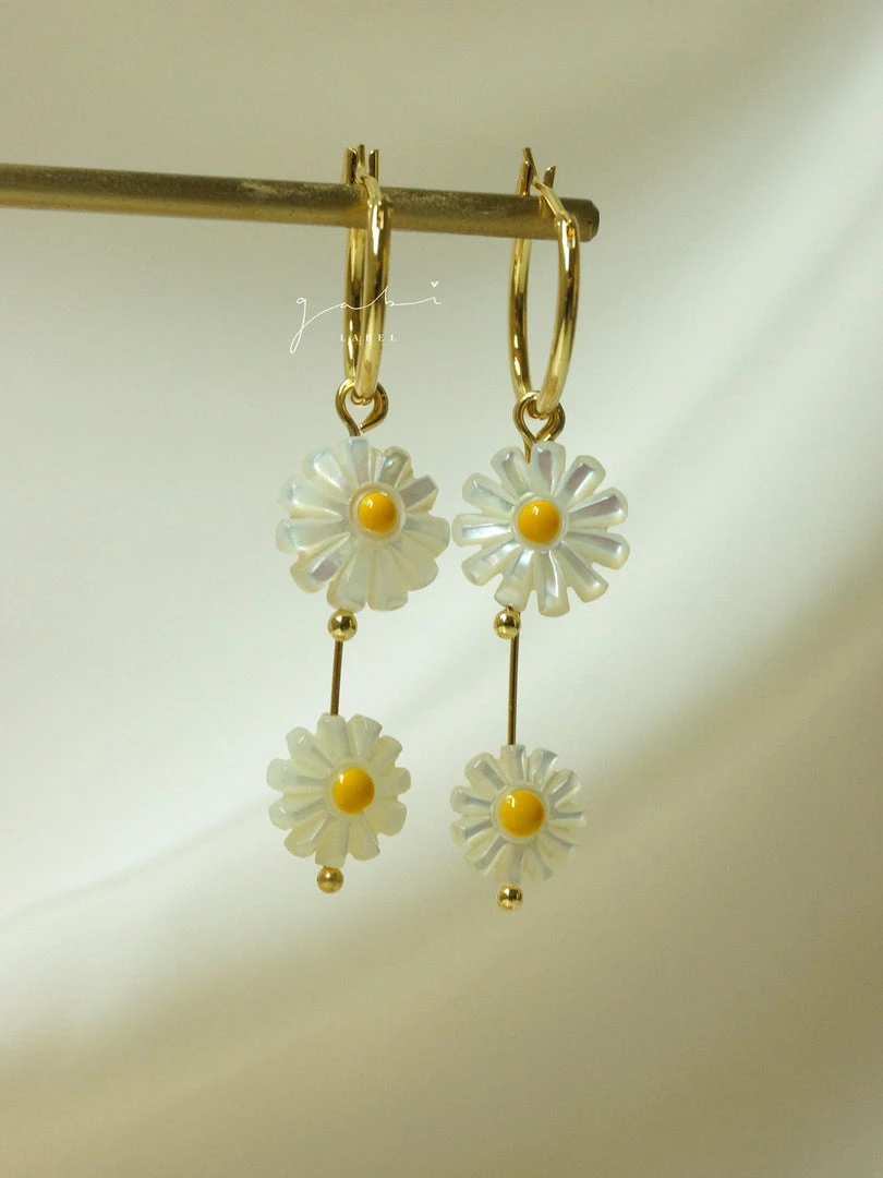 GABI STUDIO / Cute layered hoops with mini and regular-sized daisy pendants carved from natural shell.