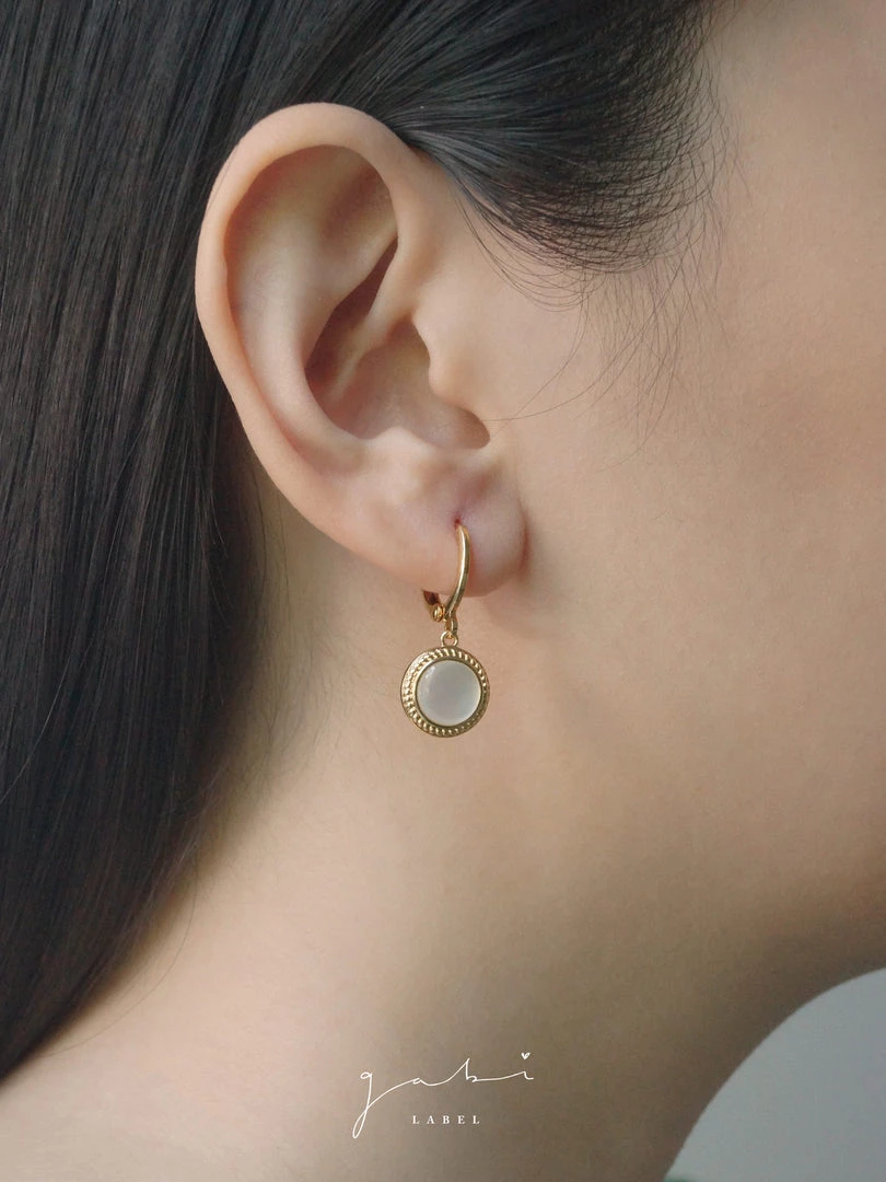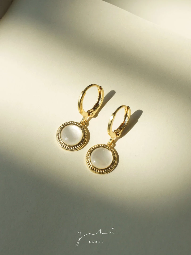 GABI STUDIO / Dainty round shell pendants on lustrous gold huggie-hoops.