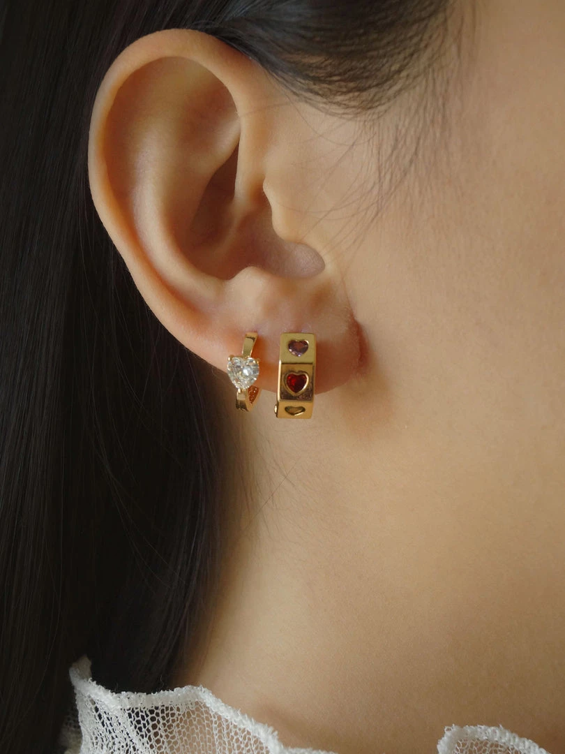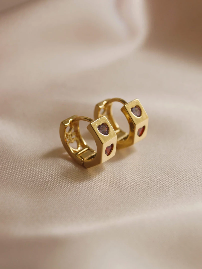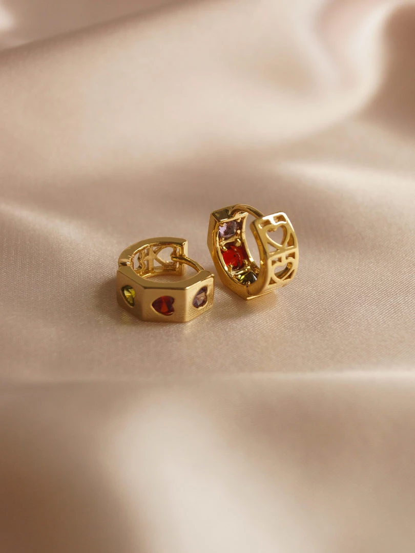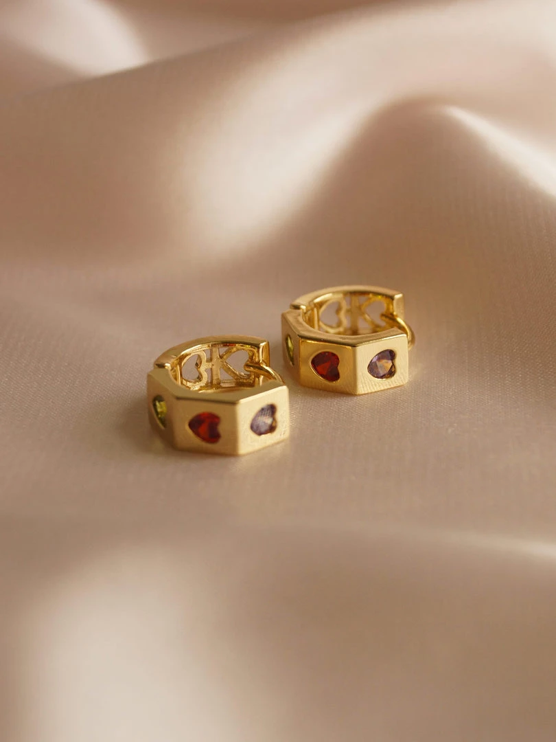 Charming octagonal huggies with coloured hearts; sold as a pair.