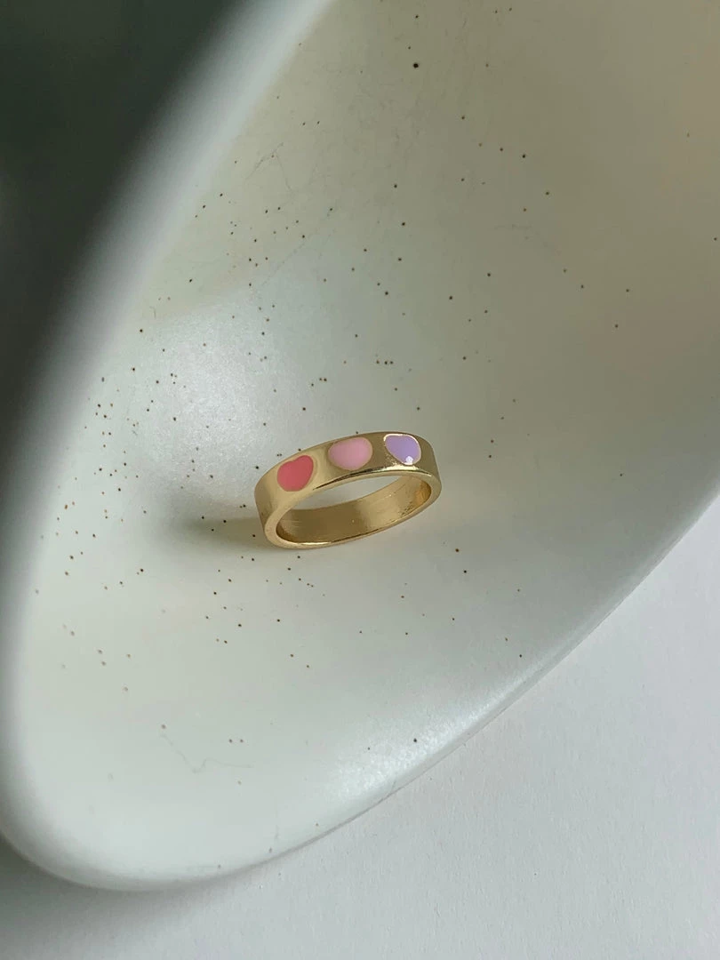 AdorableĀ gold ring with a pastel trio of painted enamel chubby hearts.