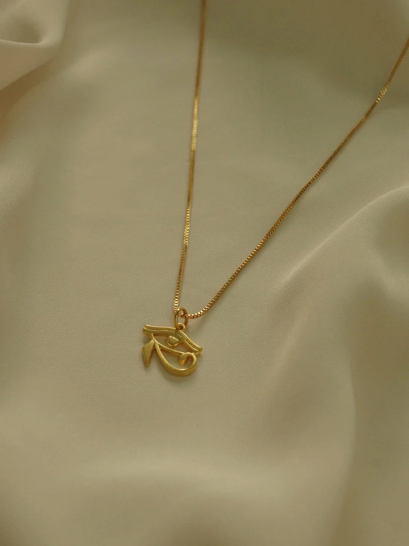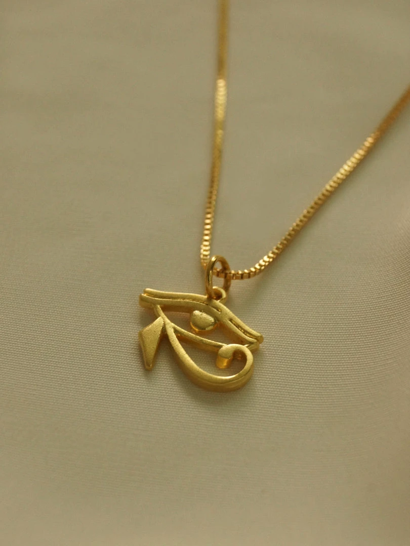 A symbolic gold necklace featuring a vintage Eye of Horus pendant;Â an ancient Egyptian symbol of protection and power.