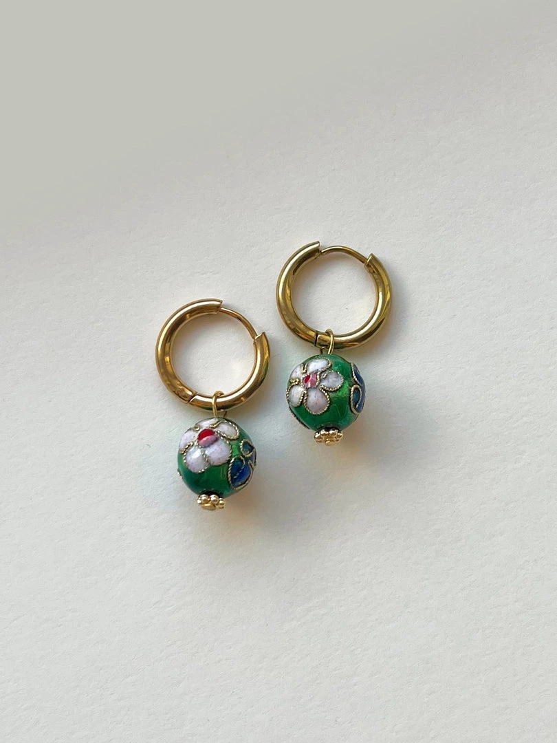 GABI STUDIO / Elegant and eclectic emerald green cloisonne bead earrings.