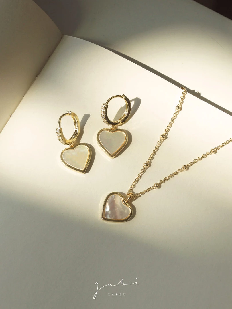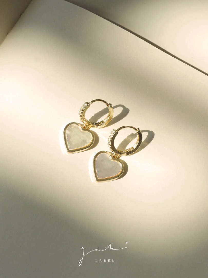 GABI STUDIO / Dainty heart shell pendants on sparkly pavé huggie-hoops.