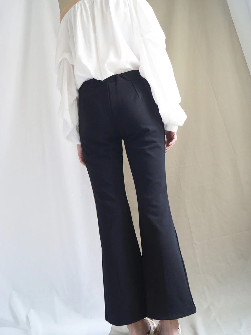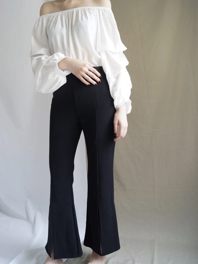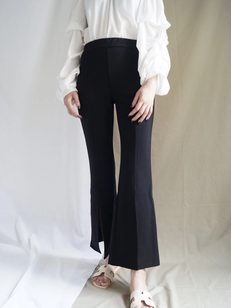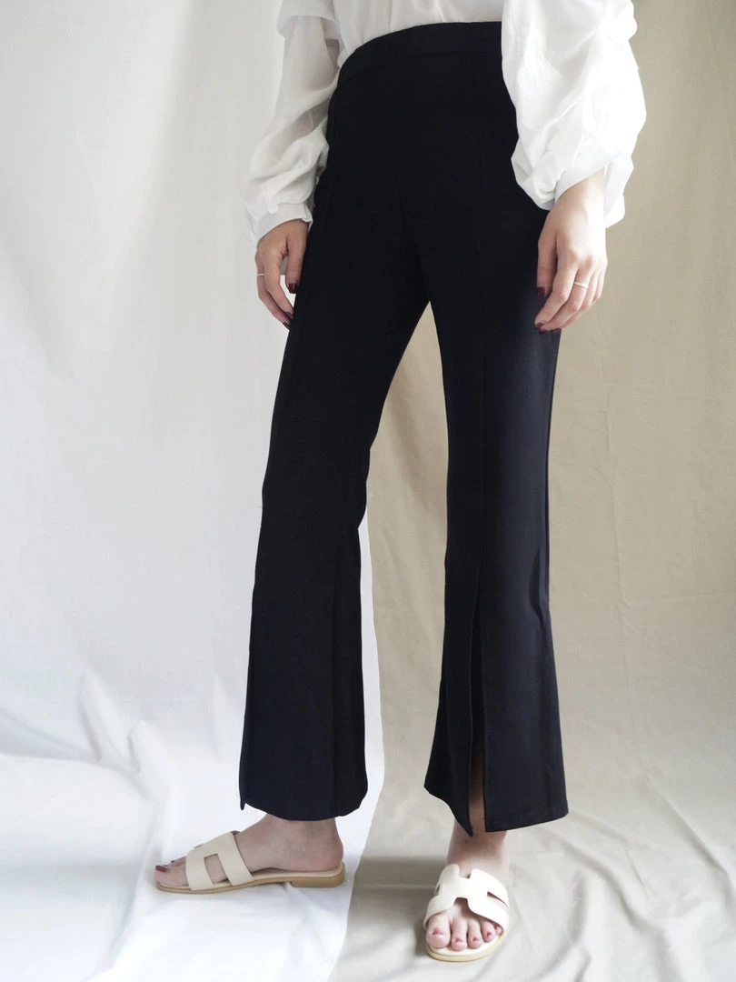 An effortlessly chic pair of black bell bottoms perfect with any top in your wardrobe. Features a stylish slit at the bottom of trousers. Comfy & slightly stretchy material.