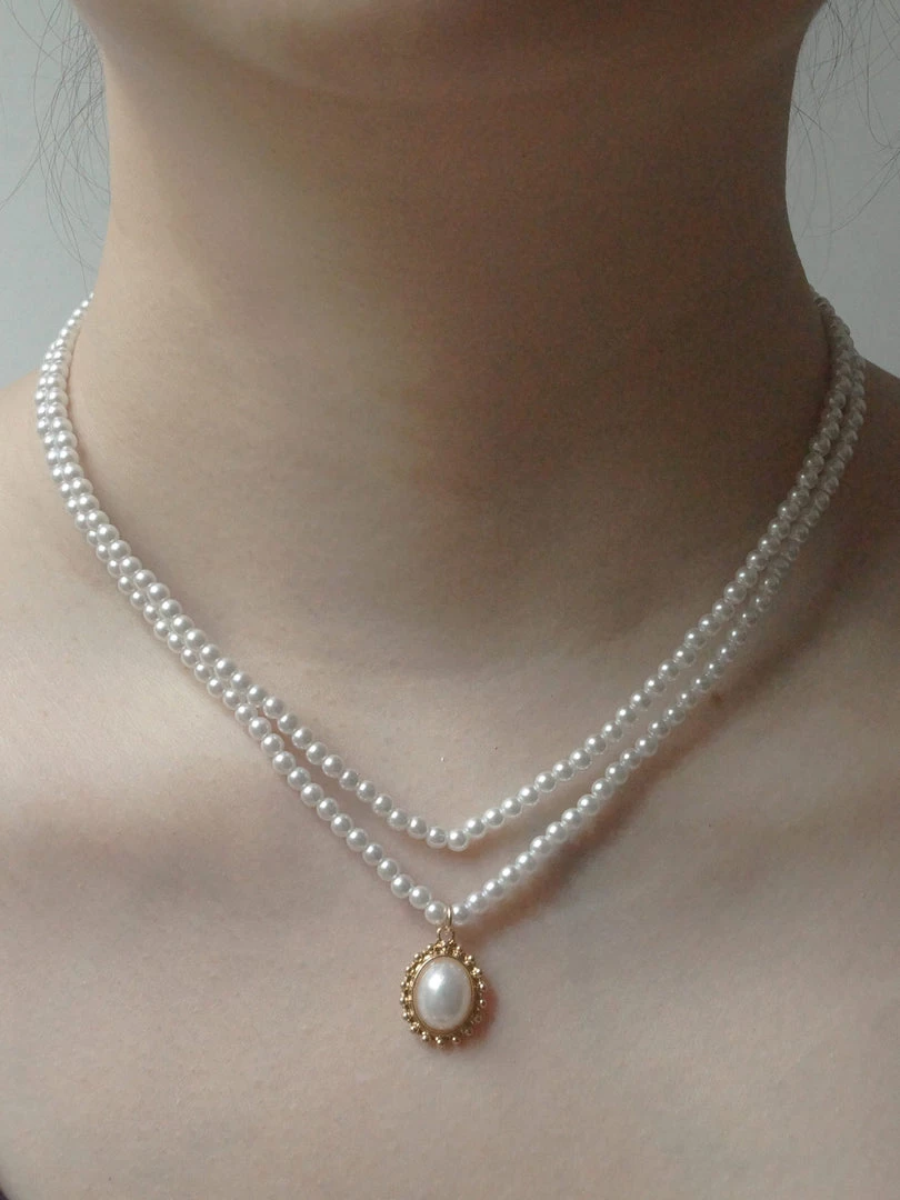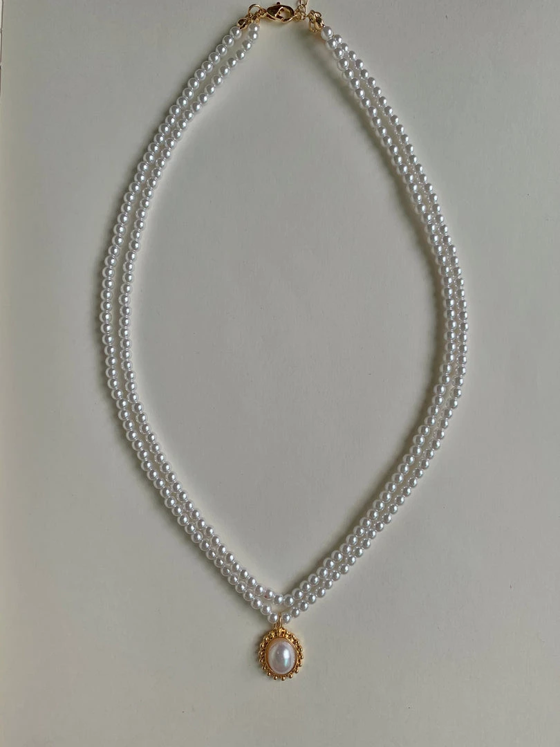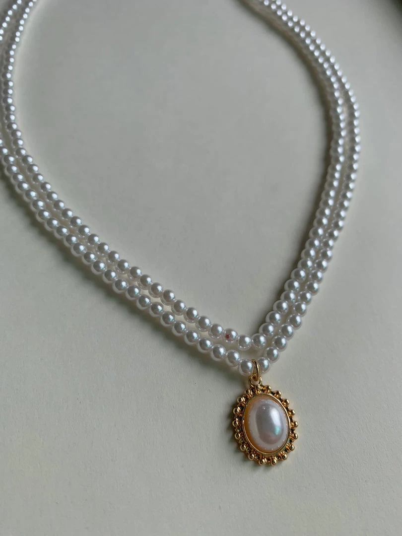 Layered faux pearl necklace with a vintage-inspired pendant.