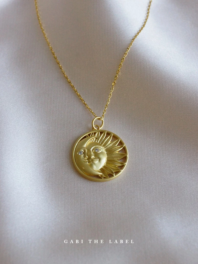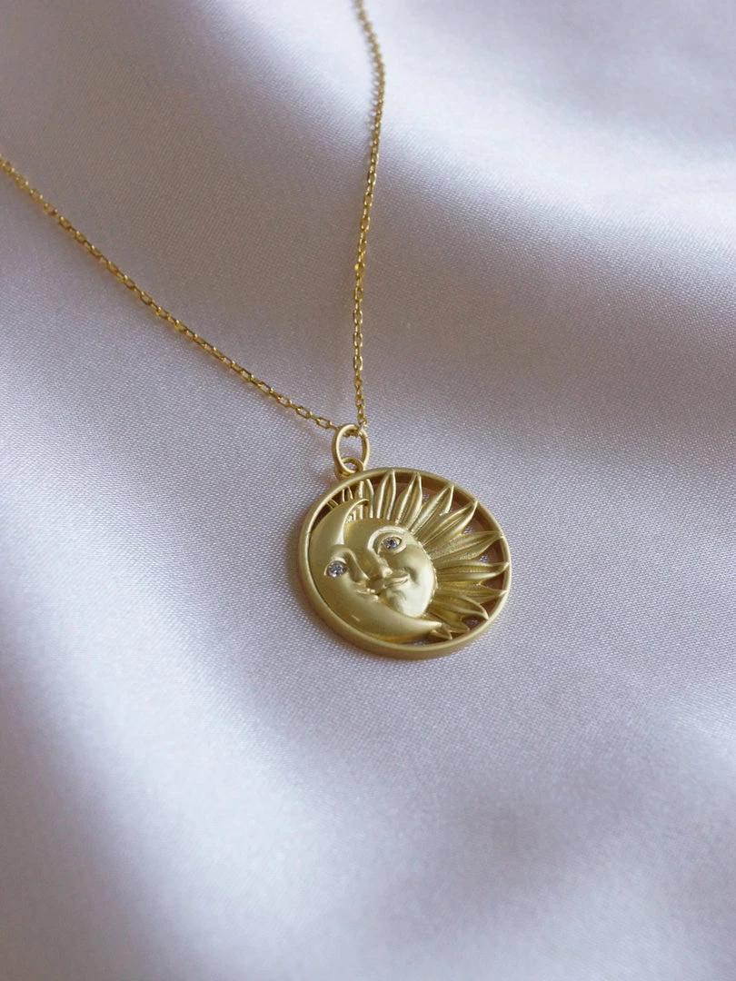 AĀ charming, matte-gold necklace featuring an intertwined sun and crescent moonĀ existing as one.