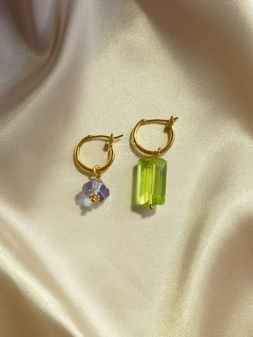 GABI STUDIO /Ā Fun mismatched hoops with fresh-coloured apple green and lilacĀ glass crystal beads.