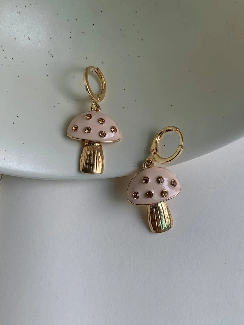 Adorable mushroom huggie hoop earrings with sparkle gemstones.