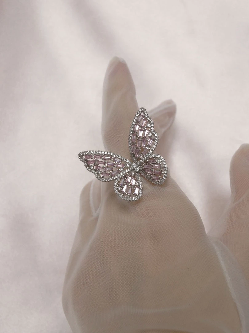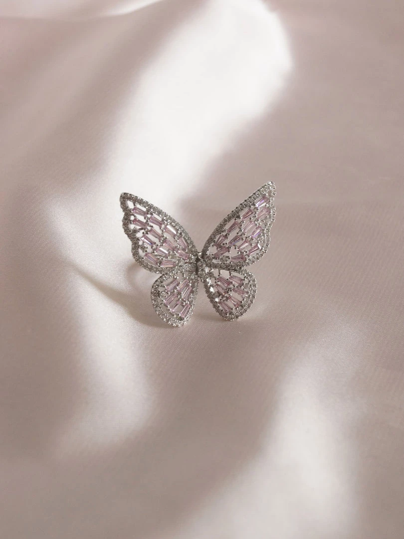 An intricate, romantic butterfly ring with inlaid baby pink rhinestones.