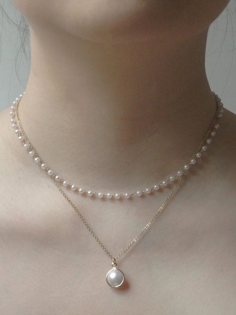 Delicate necklace with a faux pearl choker layer and dainty pearl pendant.
