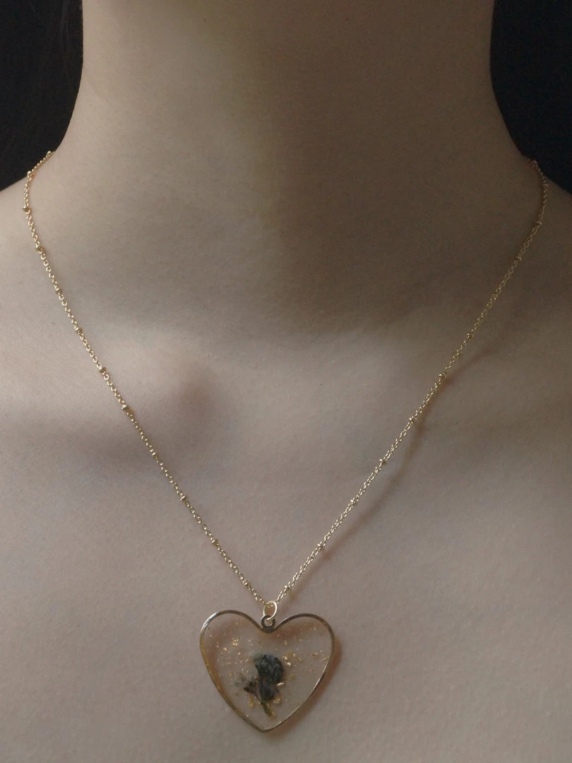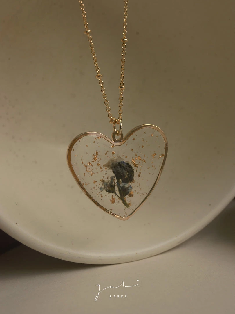 GABI STUDIO / Delicately preserved pressed flowers with tiny gold flecks, enclosed in resin heart-shaped pendant on gold necklace chain.