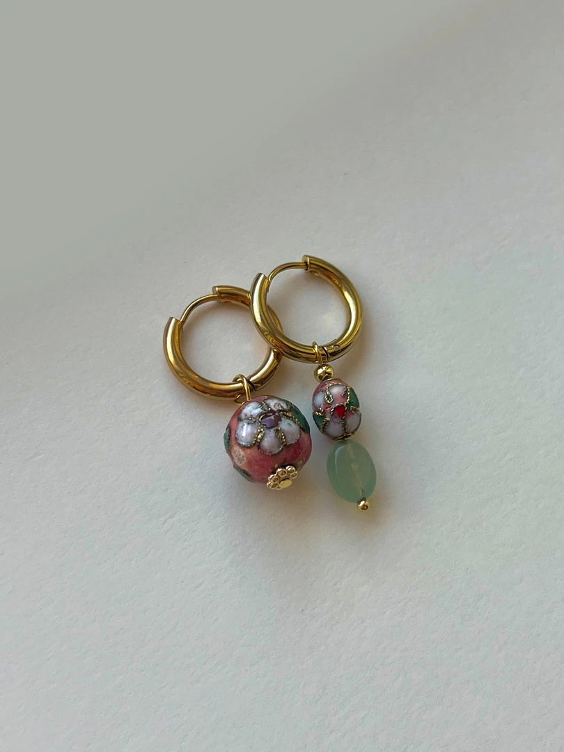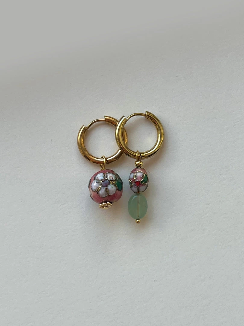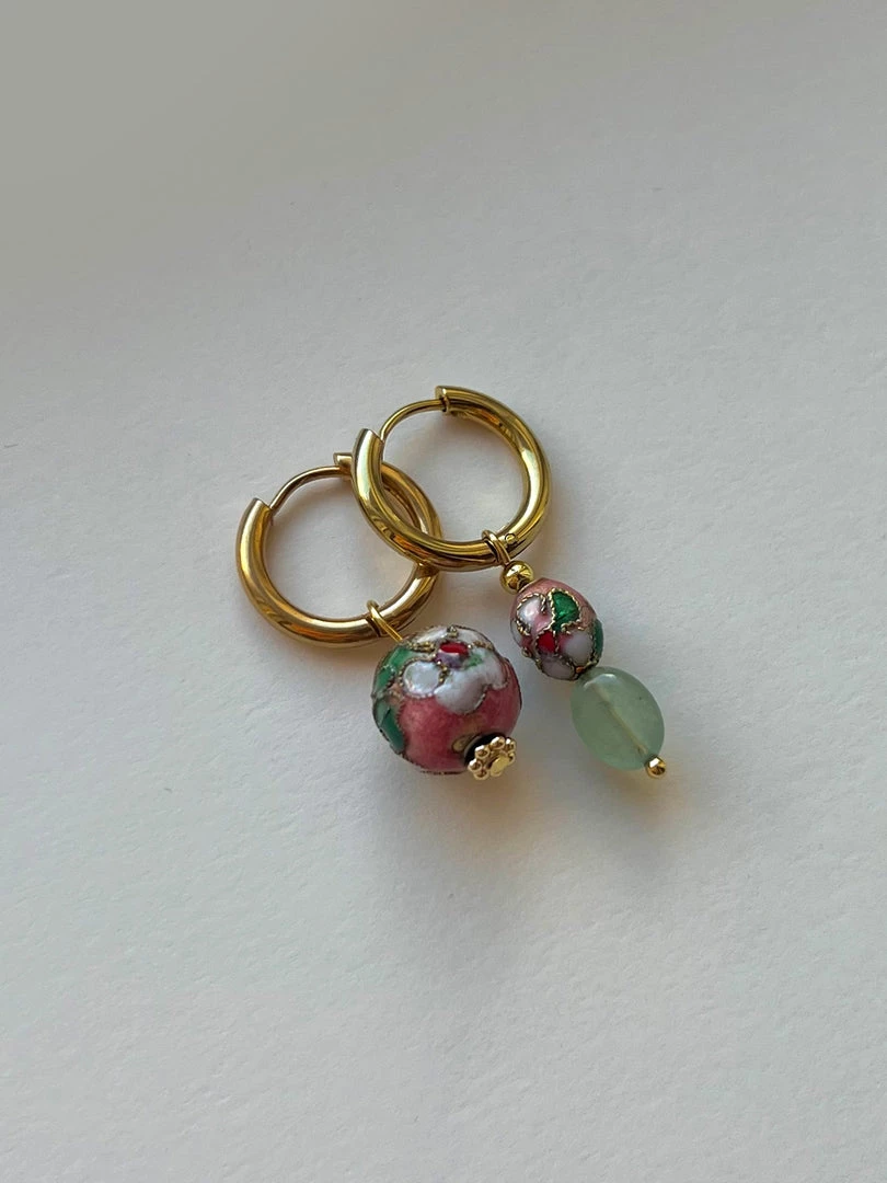 GABI STUDIO /Â Dainty mismatched earrings with dusty salmon pink cloisonne beads and green aventurine semi-precious stones.