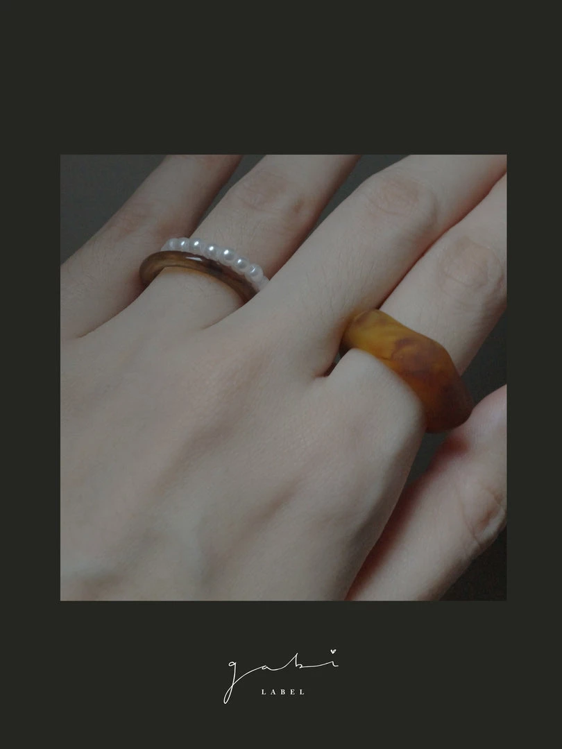 Charming set of 3 brown-coloured resin rings + stretchy pearl ring.
