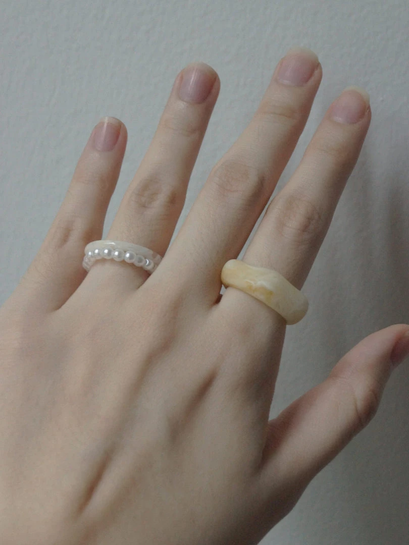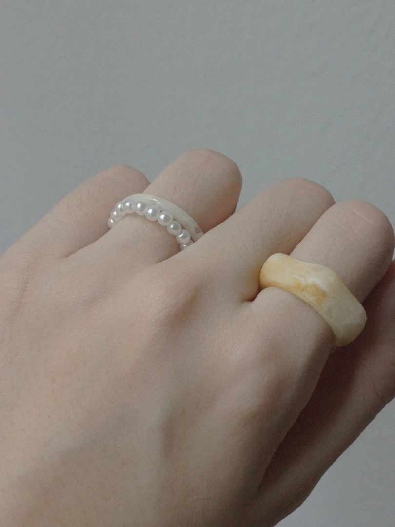 Charming set of 3 milky-coloured resin rings + stretchy pearl ring.