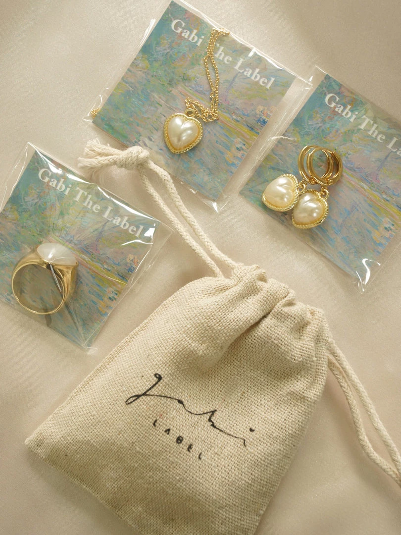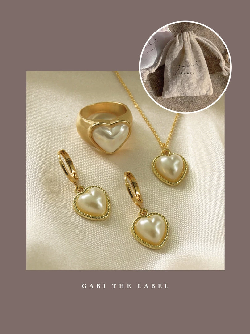 Set of Necklace + Huggies (pair) + Ring / A sweetheart set featuringĀ matchingĀ heart jewellery, all wrapped up in a cute little pouch. Perfect for gifting!