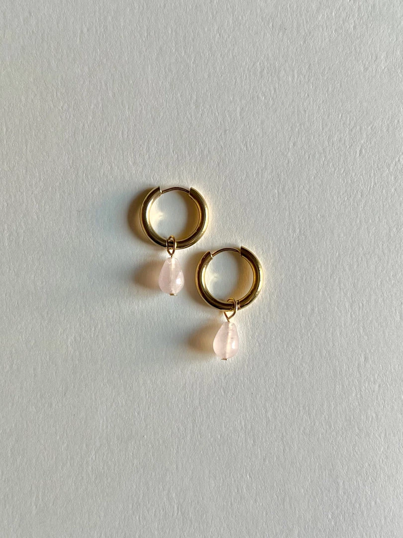 GABI STUDIO /Ā ElegantĀ rose quartzĀ earringsĀ with stainless steel hoops.